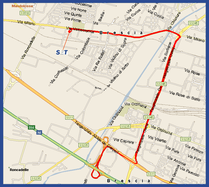 Motorway A4 MI-VE exit Brescia Ovest, at 100 mt. turn on the right, then get in the West Beltwey direction "Val Trompia", go on for about 1 Km. exit "Via Milano", at the traffic light turn on the left in "Via Valcamonica" go on for about 2 Km., turn on the left in "Via Valvestino". |