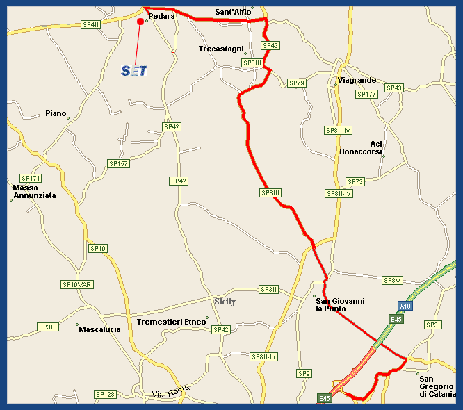 Motorway A18 ME-CT exit "San Gregorio", follow the traffic signs "Pedara", go on for about 11 Km., arrived in the suburb of Pedara follow the direction "Etna-Tardaria" go on for about 2 Km., and then turn on the left in "Via Due Palmenti". |